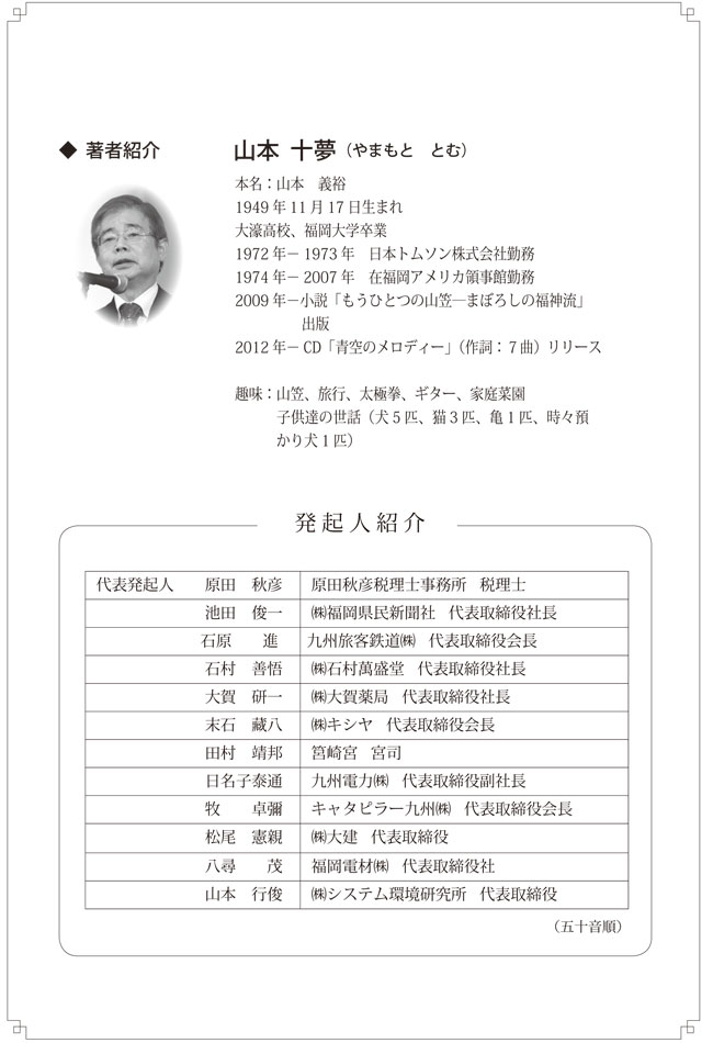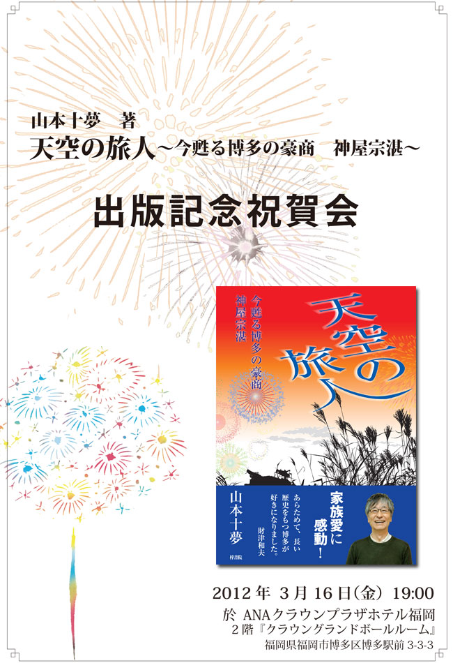 2012年3月16日(金)にANAクラウンプラザホテル福岡にて山本十夢著『天空の旅人~今甦る博多の豪商 神屋宗湛(そうたん)~』出版記念祝賀会が開催されます。